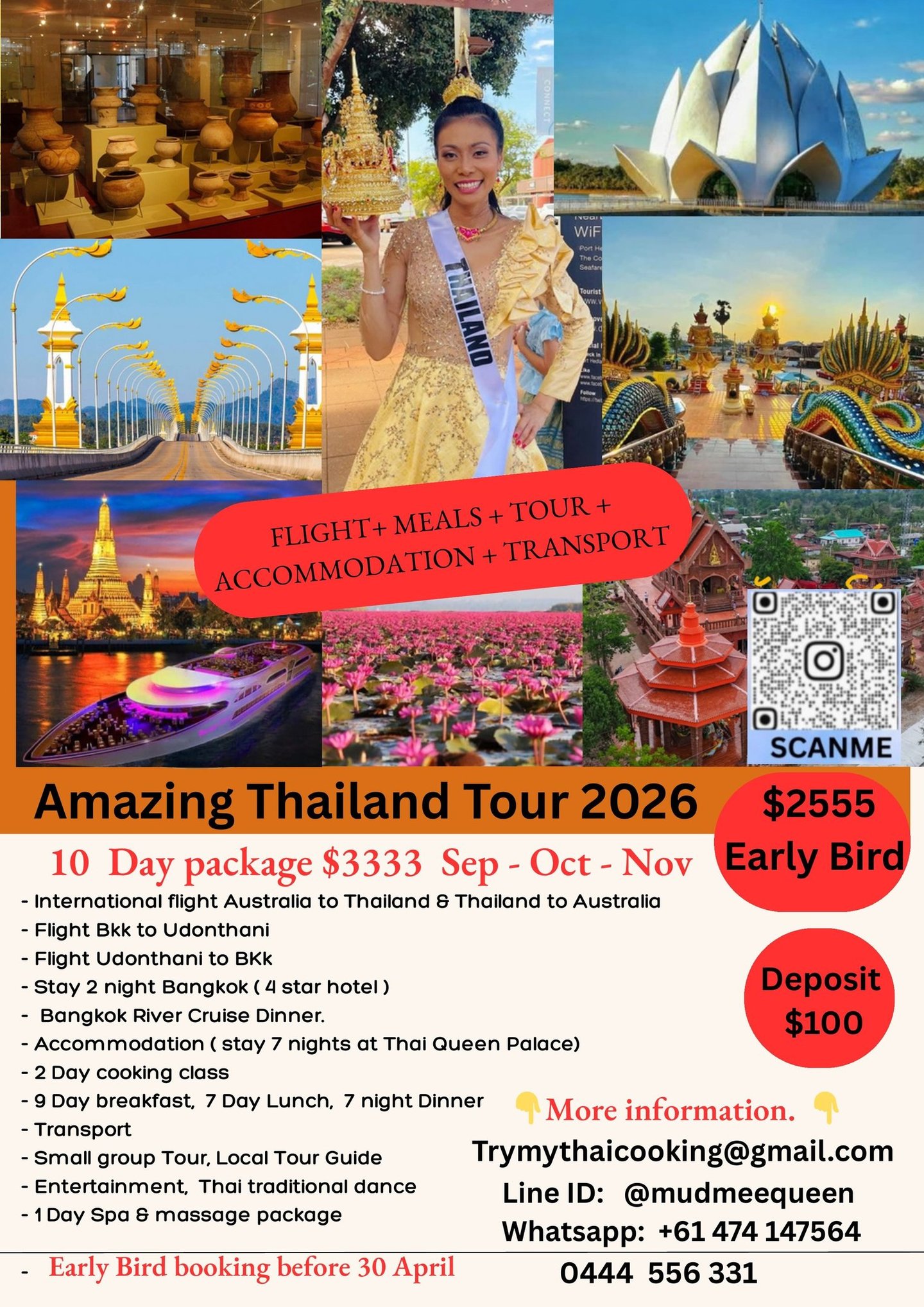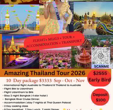 Welcome to Thailand and stay at “Thai Cooking Queen Palace” Amazing welcome night with wonderful dinner and Thai traditional dance. We bring everyone to our beautiful paradise countryside, Water lily Sea, Gold Temple, histories of war museum, White Lotus Temple, Mea Khong River, Thai-Loa friendship Bridge, Night market, local market, city tour, China town, Thai silk village, Thai cooking class with celebrity, walking tour to local village,